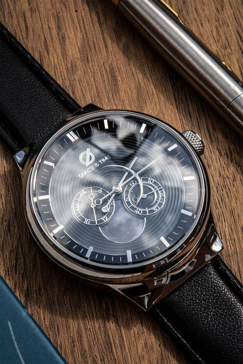 Introducing the Space and Time New Moon, a celestial marvel meticulously crafted to transcend the ordinary. This horological masterpiece is encased in robust SS316L stainless steel, exuding a timeless elegance with its polished silver sheen. The case, a refined 41 millimetres in diameter, serves as a luminous frame to the watch's deep black dial, creating a striking contrast that captures the eye and the imagination. The New Moon's design balances presence and comfort, with a lug-to-lug distance of 47.2 millimetres and a case thickness of 13.9 millimetres. This ensures a commanding yet comfortable fit on the wrist. The 20-millimeter lug width complements the sleek profile, harmonizing with the luxurious black Italian leather strap. This strap, designed to fit wrists from 16.5 to 21.5 centimetres, is equipped with a quick-release spring bar for effortless adjustments and swift strap changes. At the heart of the New Moon ticks the precision-engineered Japanese MIYOTA 82S7 Gilt automatic movement. This movement boasts an impressive accuracy range of -20 to +40 seconds per day, with a posture difference under 50 seconds and a power reserve of 48 hours. The movement vibrates at a frequency of 21,600 beats per hour, powered by 21 jewels, ensuring smooth and reliable performance. Protected by a sapphire crystal, the dial remains unmarred by the passage of time and daily wear. The watch is water-resistant up to 50 meters, making it a resilient companion for both daily adventures and more formal occasions. Weighing a mere 76 grams, the New Moon is a lightweight yet substantial piece, embodying the perfect fusion of style and functionality. Embrace the allure of the cosmos with the Space & Time New Moon, a watch that not only tells the time but also tells a story of elegance, precision, and enduring quality.
