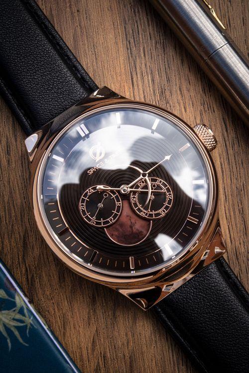 Introducing the Space & Time Red Planet, a watch that captures the fiery spirit and mystique of Mars with every tick. Crafted from durable SS316L stainless steel, this watch's case is finished in a luxurious rose gold, evoking the warm, alluring hues of the Red Planet. The 41-millimeter case size strikes a perfect balance, commanding attention without overwhelming the wrist. The Red Planet's dial is a deep, dark brown, reminiscent of the Martian surface, providing a rich backdrop that enhances the elegance of the rose gold case. With a lug-to-lug distance of 47.2 millimeters and a case thickness of 13.9 millimeters, the watch offers a comfortable yet substantial presence on the wrist. The 20-millimeter lug width seamlessly integrates with the black Italian leather strap, a symbol of sophistication and durability. Designed for versatility, the strap fits wrists ranging from 16.5 to 21.5 centimeters and features a quick-release spring bar for effortless adjustments and changes. This ensures that the Red Planet not only looks exquisite but also adapts to your needs with ease. At its heart, the Red Planet houses the reliable Japanese MIYOTA 82S7 Gilt automatic movement. This movement ensures precision with an accuracy of -20 to +40 seconds per day and maintains a posture difference under 50 seconds. With a running time of 48 hours and a vibration frequency of 21,600 beats per hour, this watch is as dependable as it is striking, powered by 21 jewels for smooth operation. The sapphire crystal glass protects the dial, offering exceptional clarity and scratch resistance, while the watch's 50-meter water resistance adds to its practicality. Despite its robust features, the Red Planet remains lightweight at 76 grams, ensuring a comfortable wear for any occasion. The Space & Time Red Planet is more than just a timepiece; it's a tribute to exploration and elegance, combining superior craftsmanship with the enchanting allure of the cosmos. Adorn your wrist with the Red Planet and let your style reach new heights.
