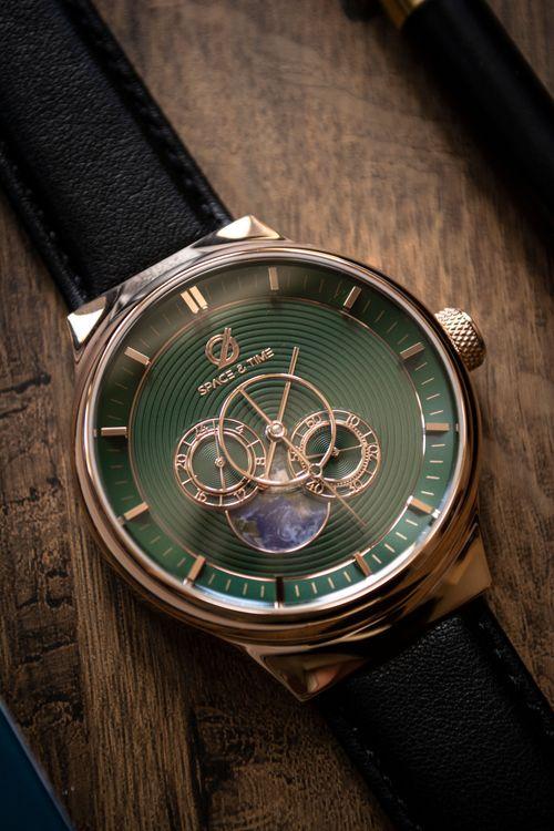 Introducing the Forest Earth, a timeless masterpiece from Space and Time, where elegance meets nature in an exquisite dance of craftsmanship and style. This watch is more than just a timepiece; it is a statement of sophistication and connection to the natural world. The Forest Earth features a robust case crafted from SS316L stainless steel, renowned for its durability and corrosion resistance. The case is adorned in a luxurious rose gold hue, adding a touch of opulence that contrasts beautifully with the deep forest green dial, reminiscent of lush woodland canopies. Measuring 41 millimetres in diameter, the case strikes a perfect balance between presence and comfort. The 47.2-millimeter lug-to-lug distance ensures a comfortable fit on a variety of wrist sizes, while the 13.9-millimeter case thickness adds a substantial feel without being overly bulky. The 20-millimeter lug width pairs seamlessly with the premium black Italian leather strap, offering both elegance and practicality. The strap is designed with quick-release spring bars, allowing for effortless changes and customization. For minimum 16.5 centimetres to maximum of 21.5 centimetres wrist sizes. The strap can be easily replaced with a longer leather strap. The Forest Earth’s dial is protected by a sapphire crystal, ensuring scratch resistance and clarity. With a water resistance of up to 50 meters, this watch is as practical as it is beautiful, ready to withstand everyday splashes and occasional submersion. At the heart of the Forest Earth beats the Automatic Japanese MIYOTA 82S7 Gilt movement, a testament to precision engineering. With an accuracy range of -20 to +40 seconds per day, this movement ensures reliable timekeeping. The posture difference is kept under 50 seconds, while the running time extends up to 48 hours, providing ample power reserve. The movement vibrates at a frequency of 21,600 times per hour and features 21 jewels, enhancing its durability and smooth operation. Weighing just 76 grams, the Forest Earth is lightweight enough for daily wear, yet substantial enough to make a statement. Whether you're in the boardroom or exploring the great outdoors, this watch will be your constant companion, merging the worlds of nature and luxury in a single, elegant package. Embrace the essence of time with the Forest Earth, where every second is a reminder of the beauty that surrounds us.
